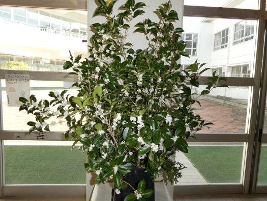 | 先週の花と似ていますね。小さい白い花がたくさん集まっています。これも香りが強く、児童昇降口の辺りによい香りを漂わせています。 |