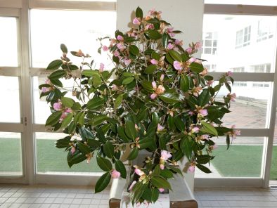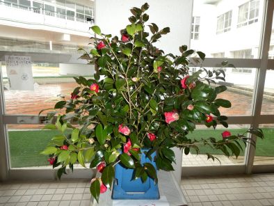 | 12月初旬にも山茶花を活けていただきました。その時はまだつぼみばかりでしたが、今は赤い花を咲かせ、見る人を楽しませてくれます。 |