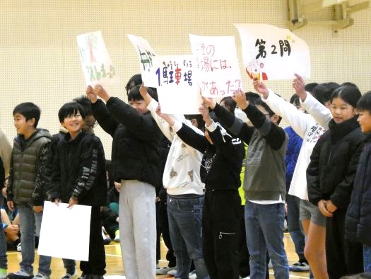 | 1年生の歓迎集会がありました。計画委員が様々な楽しい計画をしとても上手な司会進行で場を盛り上げてくれました。また、6年生も「上小レンジャー」として参上し、模範行動を示してくれたり、1年生の横につき自己紹介のお手伝いをしてくれました。後半は〇×ゲームやじゃんけん列車等をして、とても楽しい時間を過ごしました。 |