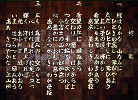 水遠白し 山田川 学びの橋に草もえて ともに生いたつはらからよ 2 つどいになごむひとときを 友と遊びし 稲荷丘 桜木かげにたたずめば 清き香りの身にしむや 3 なびく煙に高くすみ 緑かがやく 小富士山 文化の泉 くみとりて いざや進まん もろともに |